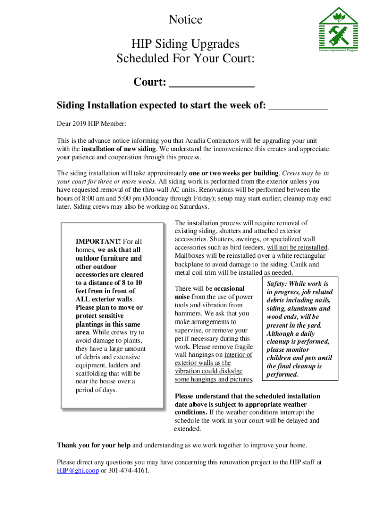 Notice HIP Siding Upgrades Scheduled For Your Court: Court: ___ Siding Installation expected to start the week of: ___ Dear 2019 HIP Member: This is the advance notice informing you that Acadia Contractors