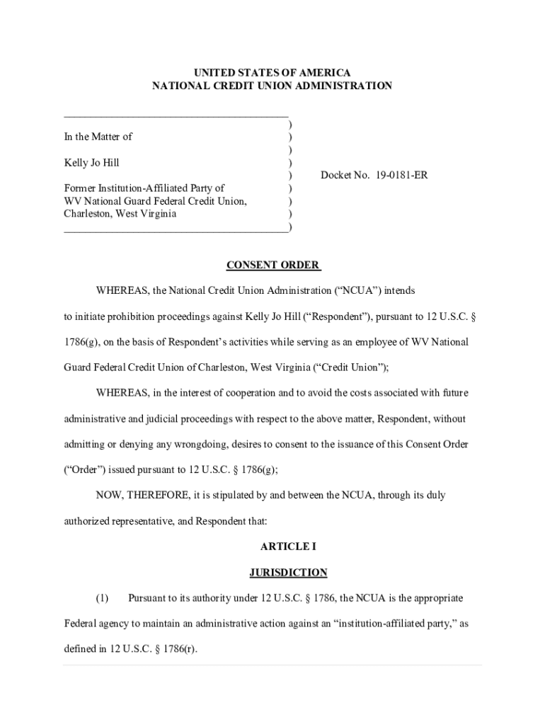 UNITED STATES OF AMERICA NATIONAL CREDIT UNION ADMINISTRATION ___) In the Matter of)) Kelly Jo Hill)) Former InstitutionAffiliated Party of) WV National Guard Federal Credit Union,) Charleston, West