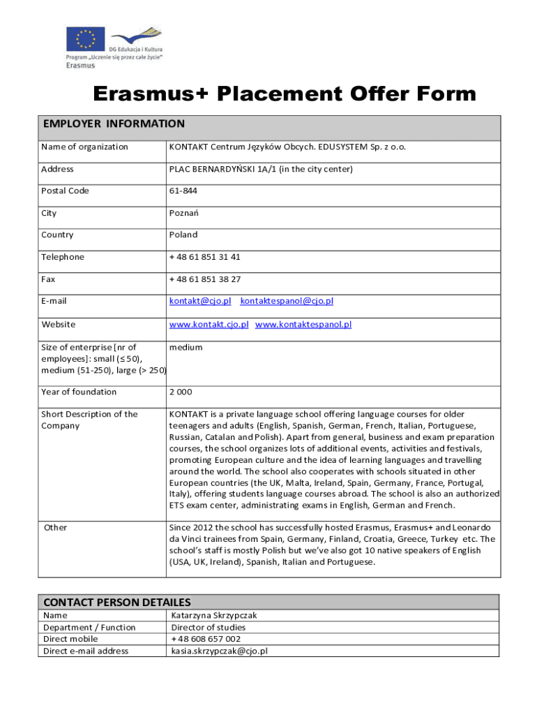 Name of organizationKONTAKT Cent rum Jack Beach. ECOSYSTEM Sp. z o.o. AddressPLAC BERNARDYSKI 1A/1 (in the city center)Postal Code61844CityPoznaCountryPolandTelephone+