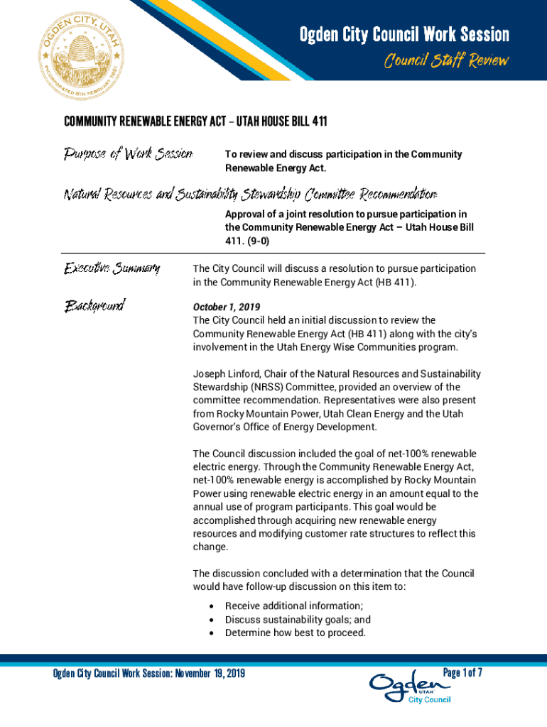 COMMUNITY RENEWABLE ENERGY ACT UTAH HOUSE BILL 411 To review and discuss participation in the Community Renewable Energy Act. Approval of a joint resolution to pursue participation in the Community