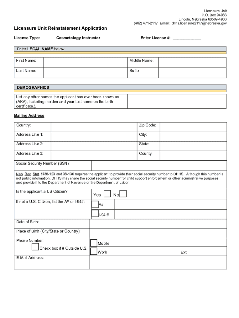 Cosmetology Instructor Reinstatement Information If the license was disciplined, please contact the Licensure Unit DHHS.Licensure2117@nebraska.gov for the appropriate reinstatement application ___
