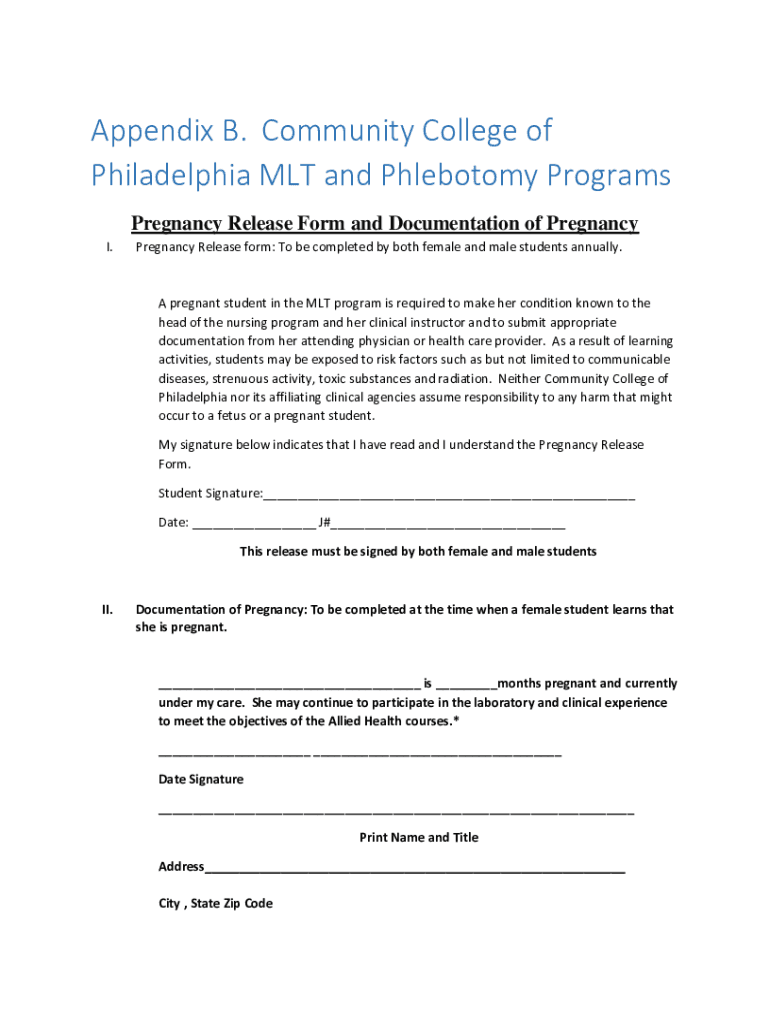 Appendix B. Community College of Philadelphia MLT and Phlebotomy Programs Pregnancy Release Form and Documentation of Pregnancy I. Pregnancy Release form: To be completed by both female and male students