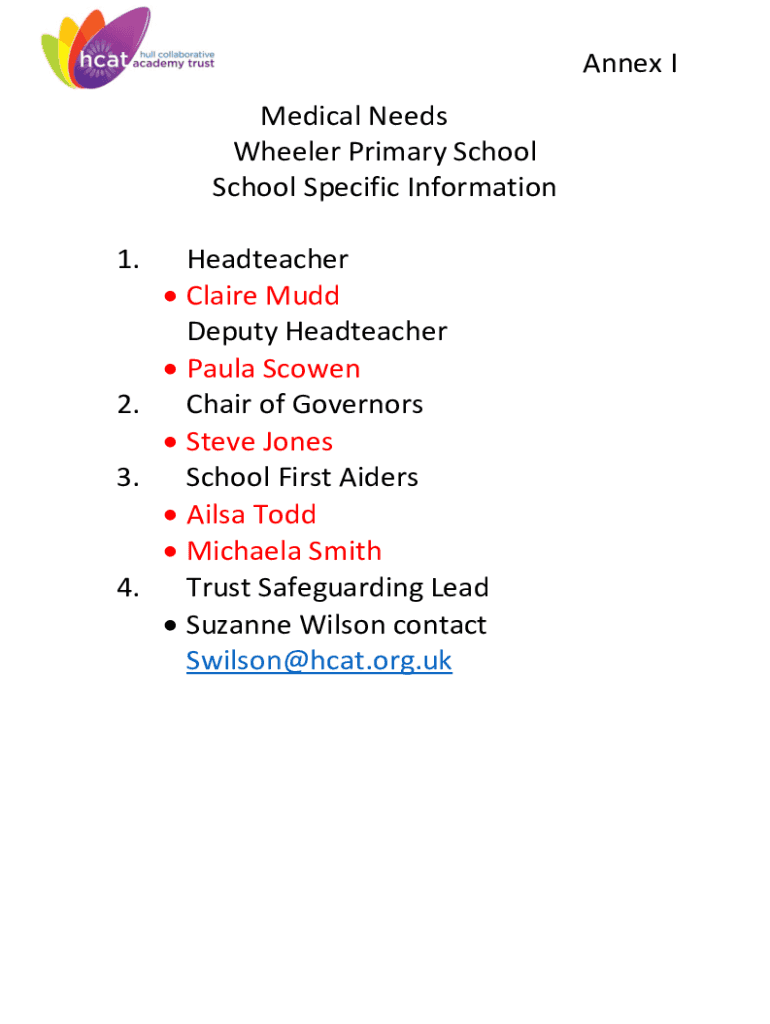Annex I Medical Needs Wheeler Primary School Specific Information 1. Headteacher Claire Mud Deputy Headteacher Paula Cowen 2. Chair of Governors Steve Jones 3. School First Aiders Alisa Todd Michaela