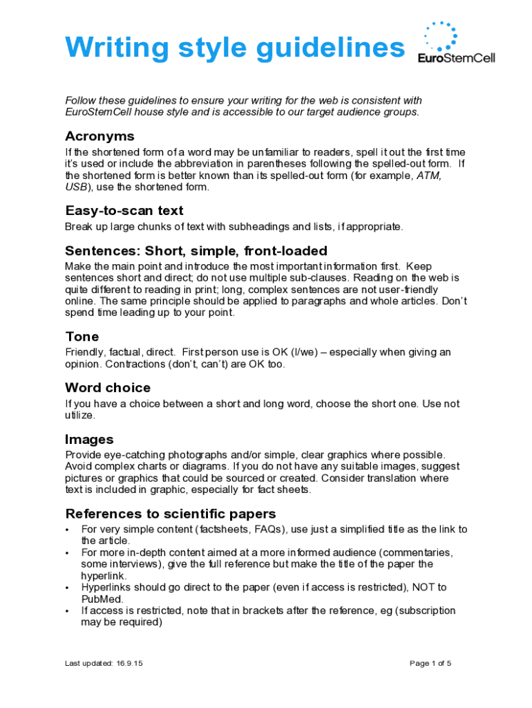Writing style guidelines Follow these guidelines to ensure your writing for the web is consistent with EuroStemCell house style and is accessible to our target audience groups. Acronyms If the shortened