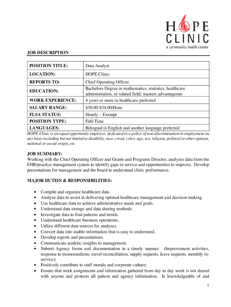 JOB DESCRIPTION POSITION TITLE:Data AnalystLOCATION:HOPE ClinicREPORTS TO:WORK EXPERIENCE:Chief Operating Officer Bachelors Degree in mathematics, statistics, healthcare administration, or related