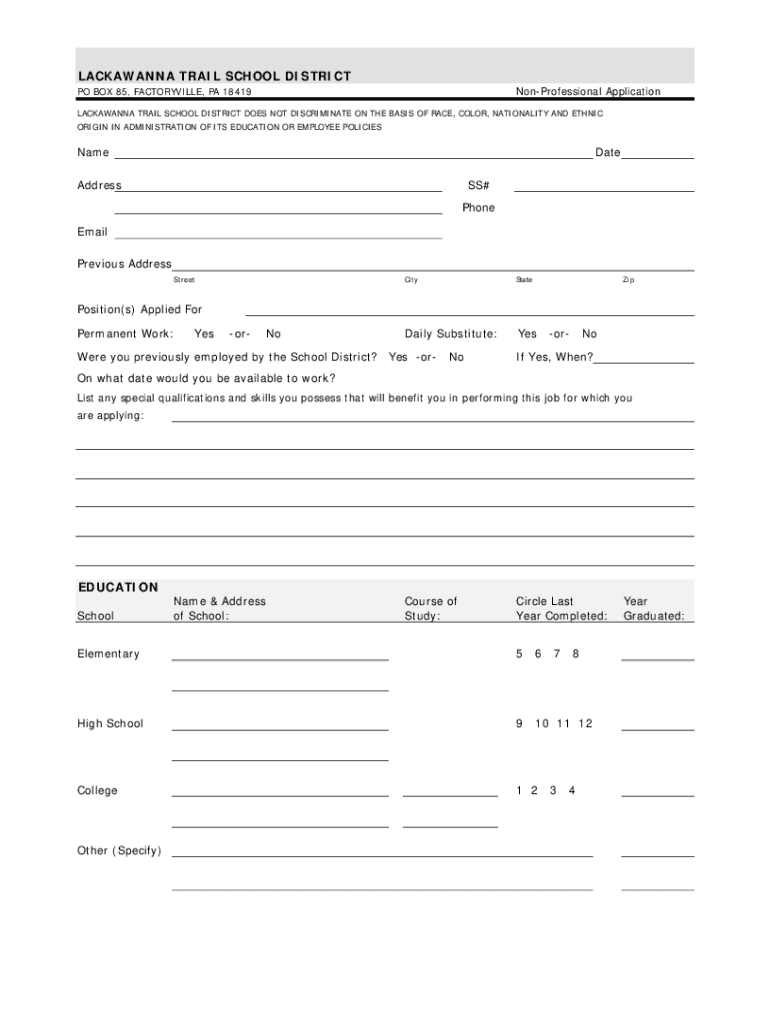LACKAWANNA TRAIL SCHOOL DISTRICT Nonprofessional Application PO BOX 85, VICTORVILLE, PA 18419LACKAWANNA TRAIL SCHOOL DISTRICT DOES NOT DISCRIMINATE ON THE BASIS OF RACE, COLOR, NATIONALITY AND ETHNIC