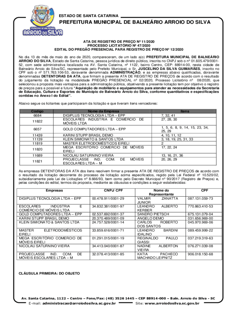 ESTATE DE SANTA CATARINAPREFEITURA MUNICIPAL DE ALBERIO ARROYO DO SILVANA DE REGISTRY DE PRO N 11/2020 PROCESS LIMITATION N 47/2020 EDIT AL DO PRESO PRESENCE PARA REGISTRY DE PRO N 12/2020 Now did