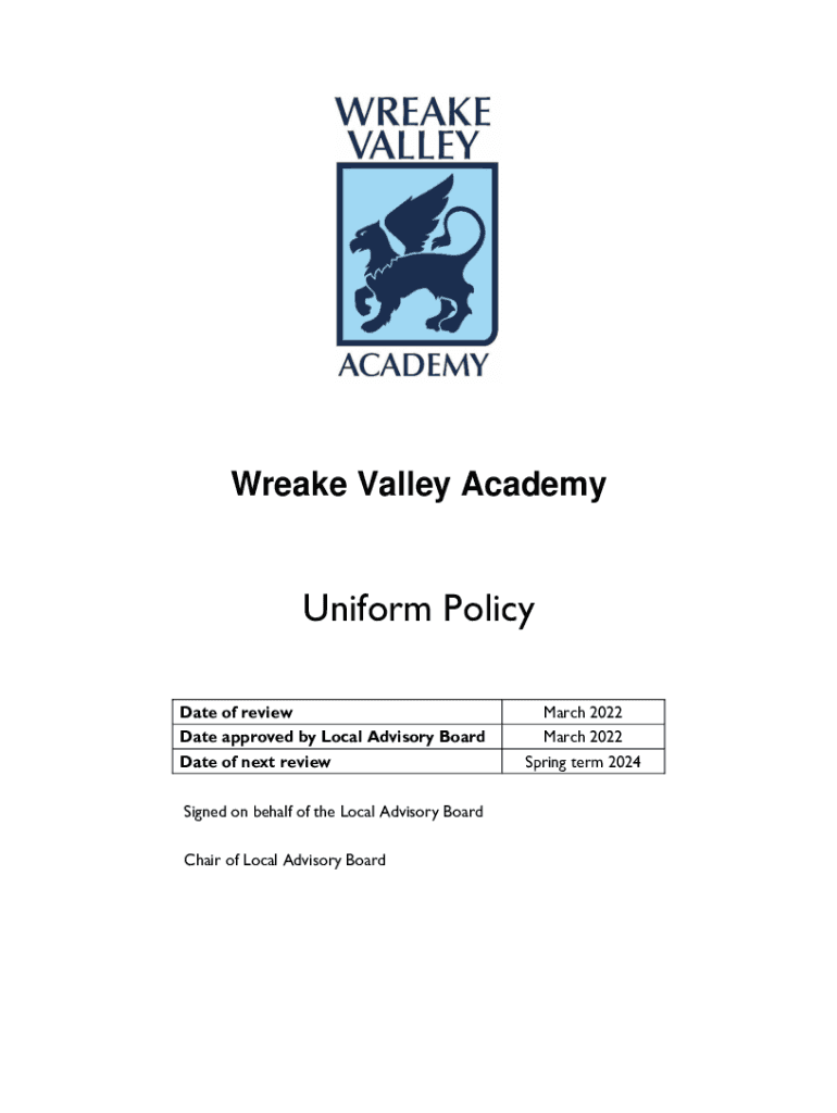 Wreak Valley AcademyUniform Policy Date of review Date approved by Local Advisory Board Date of next review Signed on behalf of the Local Advisory Board Chair of Local Advisory Board March 2022 March