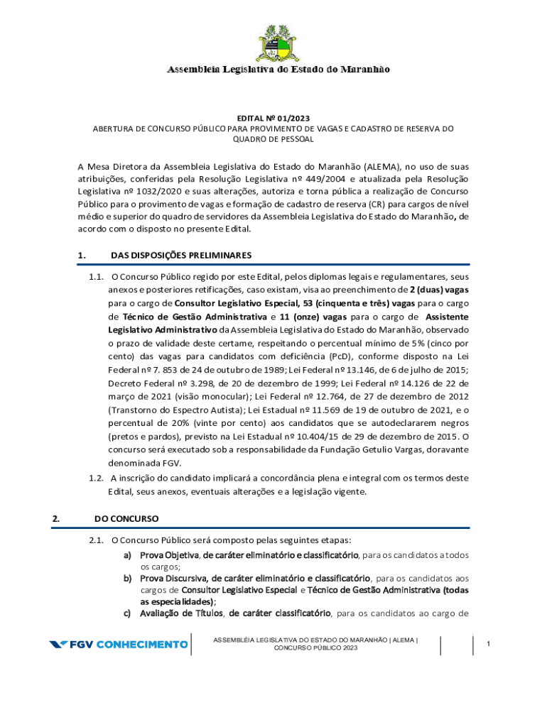EDIT AL N 01/2023 APERTURE DE CONCURS PBL ICO PARA PROVIDENT DE VEGAS E CASTRO DE RESERVE DO QUAD RO DE PERSONAL Mesa Director the Assembled Legislative do Est ado do Maranhão (ALMA), no us ode seas