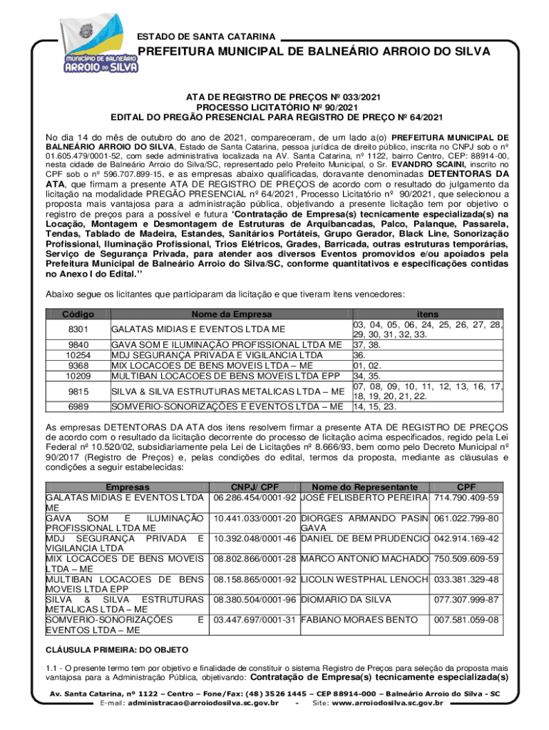 ESTATE DE SANTA CATARINAPREFEITURA MUNICIPAL DE ALBERIO ARROYO DO SILVANA DE REGISTRY DE PRESS N 033/2021 PROCESS LIMITATION N 90/2021 EDIT AL DO PRESO PRESENCE PARA REGISTRY DE PRO N 64/2021 Now