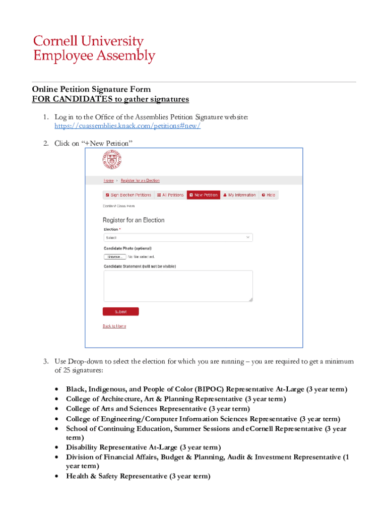 Online Petition Signature Form FOR CANDIDATES to gather signatures 1. Log in to the Office of the Assemblies Petition Signature website: https://cuassemblies.knack.com/petitions#new/ 2. Click on +New