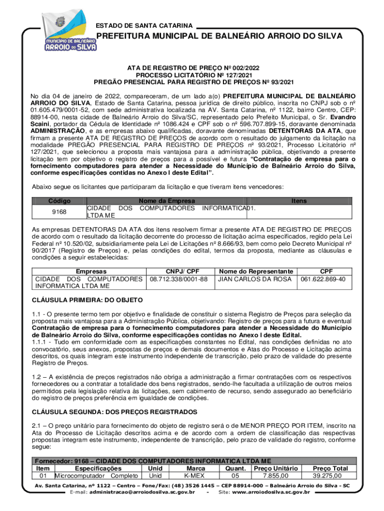 ESTATE DE SANTA CATARINAPREFEITURA MUNICIPAL DE ALBERIO ARROYO DO SILVANA DE REGISTRY DE PRO N 002/2022