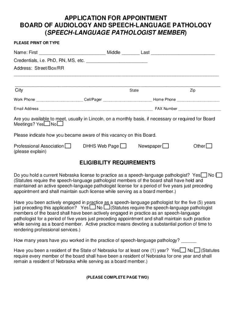 APPLICATION FOR APPOINTMENT BOARD OF AUDIOLOGY AND SPEECHLANGUAGE PATHOLOGY (SPEECHLANGUAGE PATHOLOGIST MEMBER) PLEASE PRINT OR Typeface: First ___ Middle ___ Last ___ Credentials, i.e. PhD, RN, MS,
