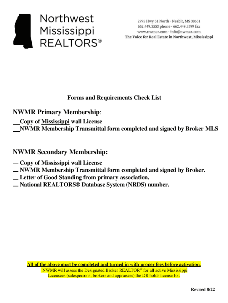 Forms and Requirements Check Listener Primary Membership: Copy of Mississippi wall License NMR Membership Transmittal form completed and signed by Broker MISNOMER Secondary Membership: Copy of Mississippi