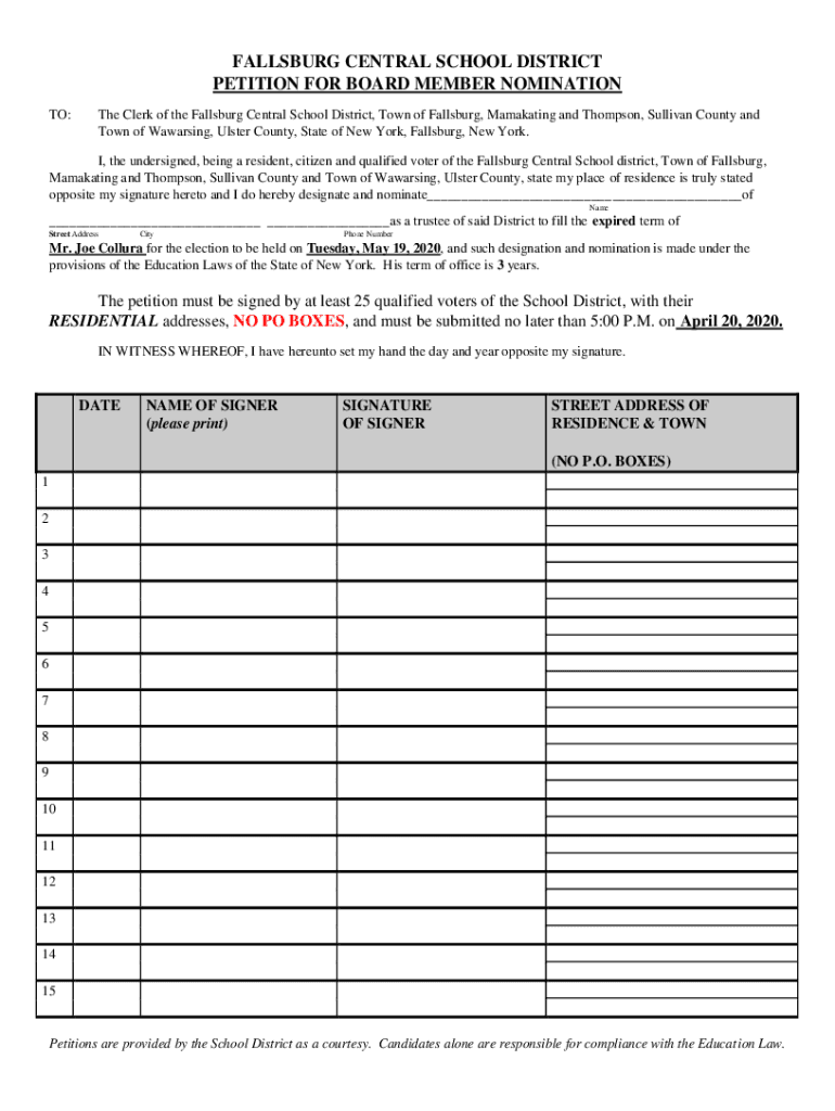 GALESBURG CENTRAL SCHOOL DISTRICT PETITION FOR BOARD MEMBER NOMINATION TO:The Clerk of the Falls burg Central School District, Town of Falls burg, Marketing and Thompson, Sullivan County and Town