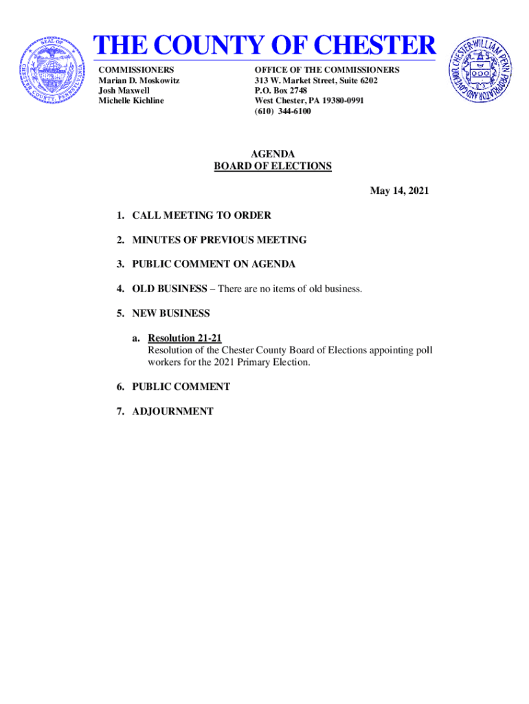 THE COUNTY OF CHESTER COMMISSIONERS Marian D. Moskovitz Josh Maxwell Michelle KichlineOFFICE OF THE COMMISSIONERS 313 W. Market Street, Suite 6202 P.O. Box 2748 West Chester, PA 193800991 (610) 3446100AGENDA