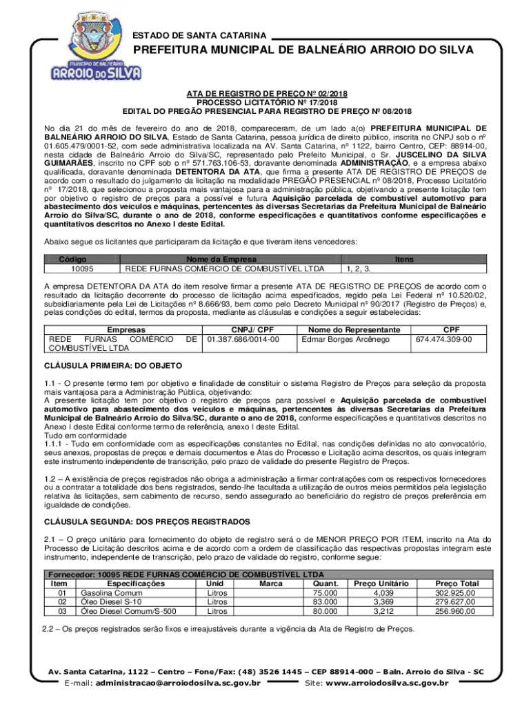 ESTATE DE SANTA CATARINAPREFEITURA MUNICIPAL DE ALBERIO ARROYO DO SILVANA DE REGISTRY DE PRO N 02/2018