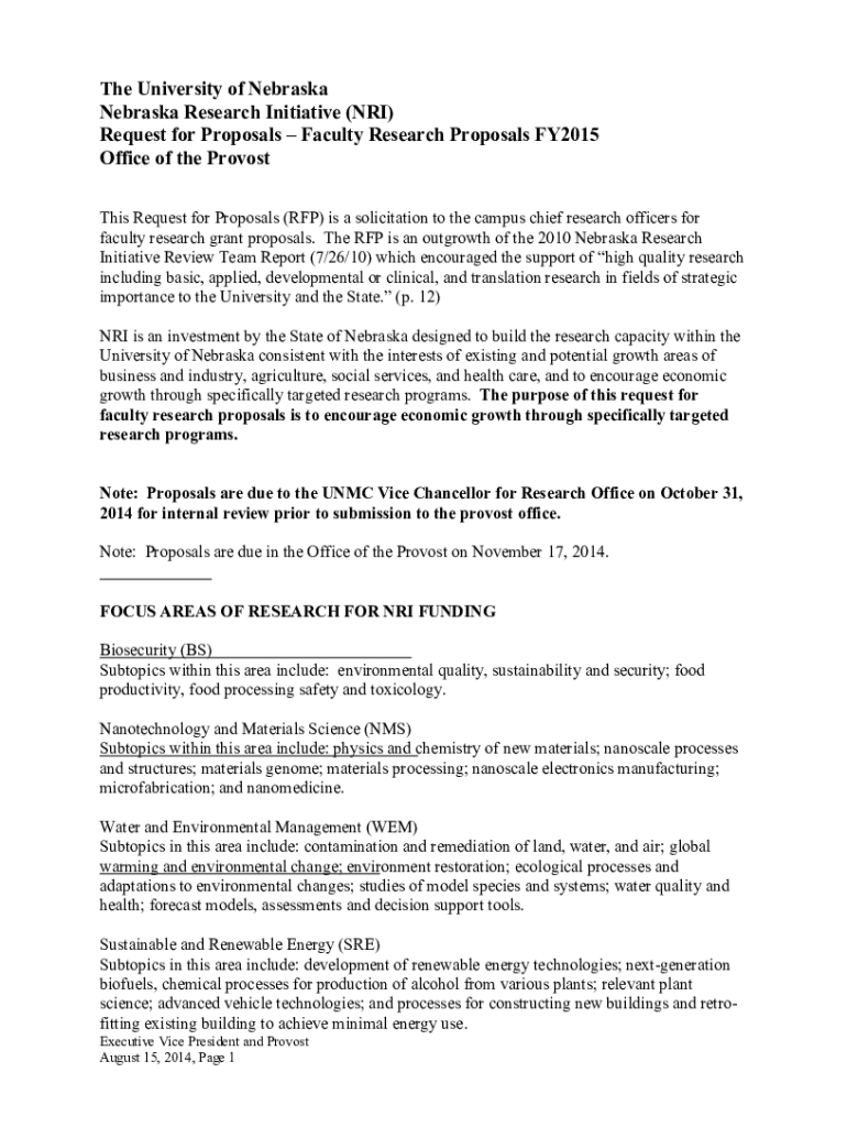 The University of Nebraska Research Initiative (NRI) Request for Proposals Faculty Research Proposals FY2015 Office of the Provost This Request for Proposals (RFP) is a solicitation to the campus