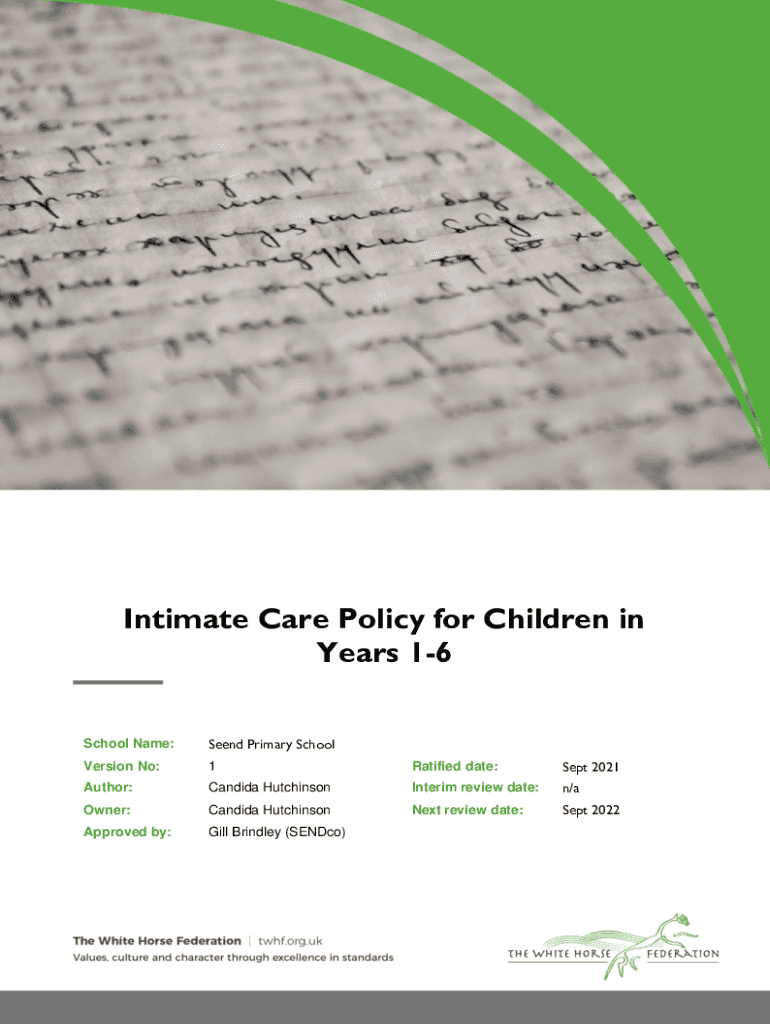 Intimate Care Policy for Children in Years 16 School Name:Seen Primary SchoolVersion No:1Ratified date:Sept 2021Author:Candida HutchinsonInterim review date:n/owner:Candida HutchinsonNext review date:Sept