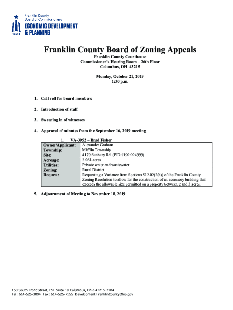 Franklin County Board of Zoning Appeals Franklin County Courthouse Commissioners Hearing Room 26th Floor Columbus, OH 43215 Monday, October 21, 2019 1:30 p.m.1. Call roll for board members 2. Introduction