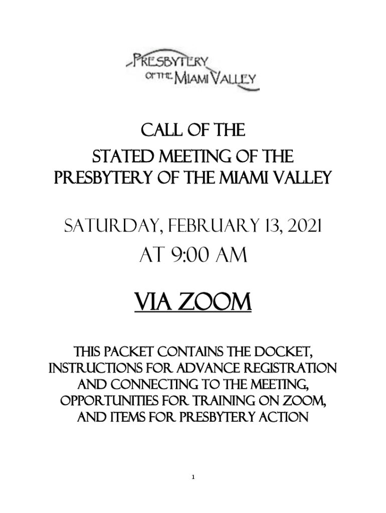 CALL OF THE STATED MEETING OF THE PRESBYTERY OF THE MIAMI VALLEY Saturday, February 13, 2021at 9:00 Via ZOOM This packet contains the Docket, instructions for advance registration and connecting to