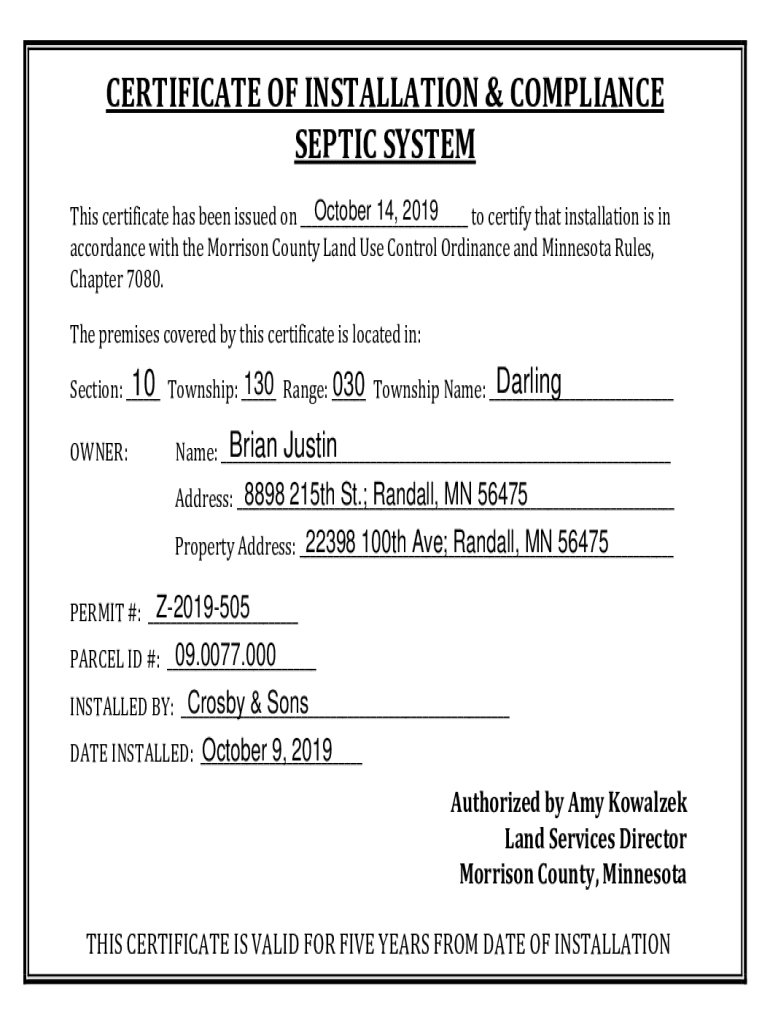 CERTIFICATE OF INSTALLATION & COMPLIANCE SEPTIC SYSTEM October 14, 2019, This certificate has been issued on ___ to certify that installation is in accordance with the Morrison County Land Use Control