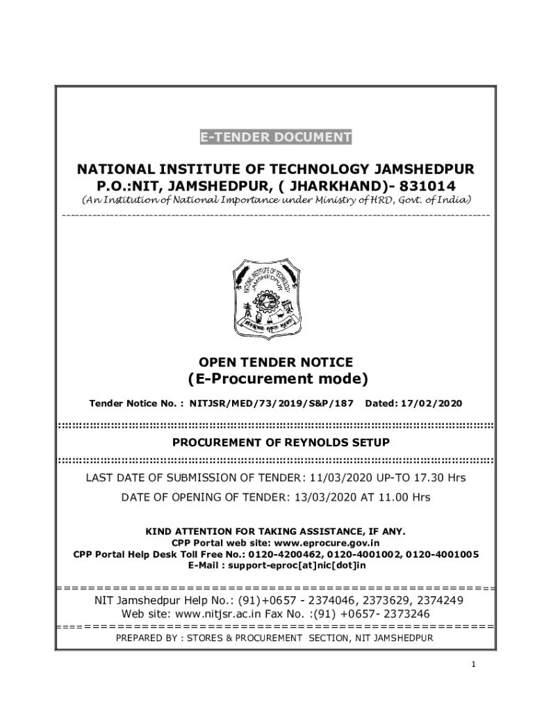 TENDER DOCUMENTATION INSTITUTE OF TECHNOLOGY JAMSHEDPUR P.O.:NIT, JAMSHEDPUR, (JHARKHAND) 831014 (An Institution of National Importance under Ministry of HRD, Govt. of India) ___OPEN TENDER NOTICE(Procurement