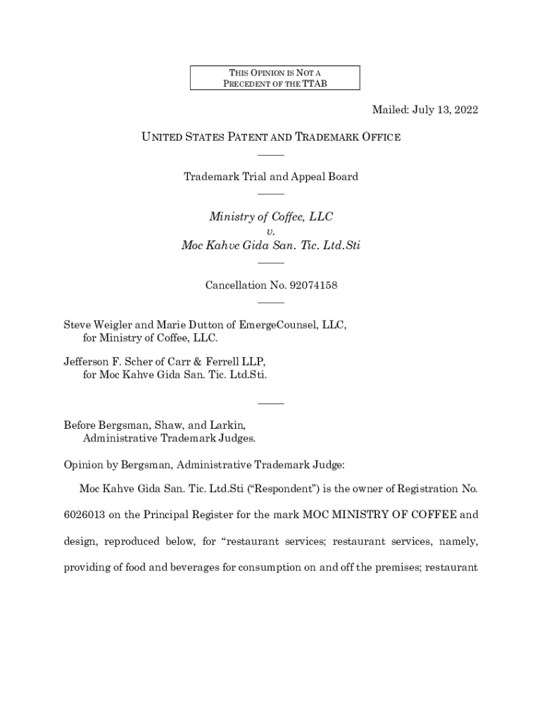 THIS OPINION IS NOT A PRECEDENT OF THE Travailed: July 13, 2022UNITED STATES PATENT AND TRADEMARK OFFICE ___ Trademark Trial and Appeal Board ___Ministry of Coffee, LLC v. MOC Have Gina San. Tic.