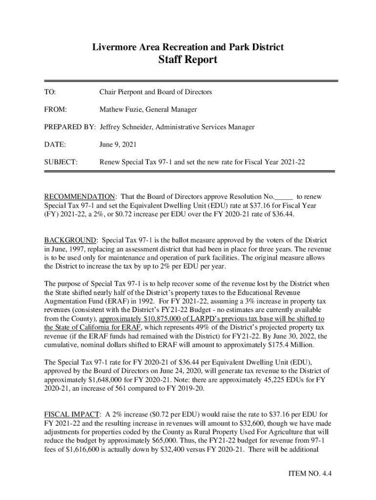 Livermore Area Recreation and Park DistrictStaff Report TO:Chair Pierpont and Board of DirectorsFROM:Mathew Suzie, General ManagerPREPARED BY: Jeffrey Schneider, Administrative Services Manager DATE:June