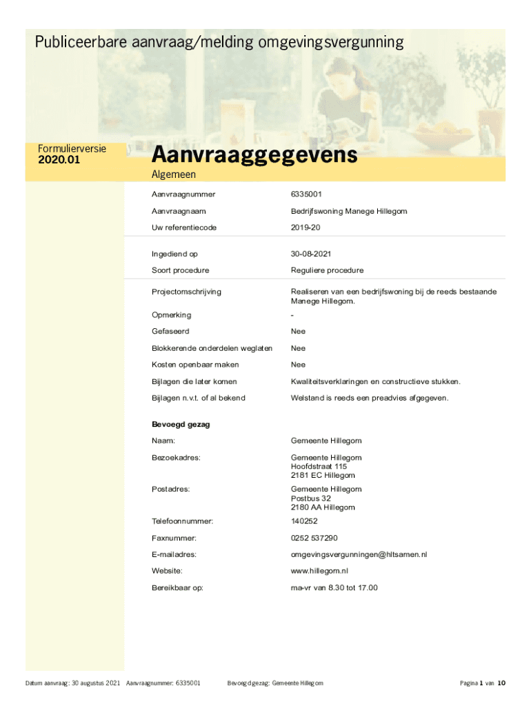 Publiceerbare aanvraag/melding omgevingsvergunningFormulierversie 2020.01Aanvraaggegevens Algerian Aanvraagnummer6335001AanvraagnaamBedrijfswoning Manage HillegomUw referentiecode201920Ingediend op30082021Soort