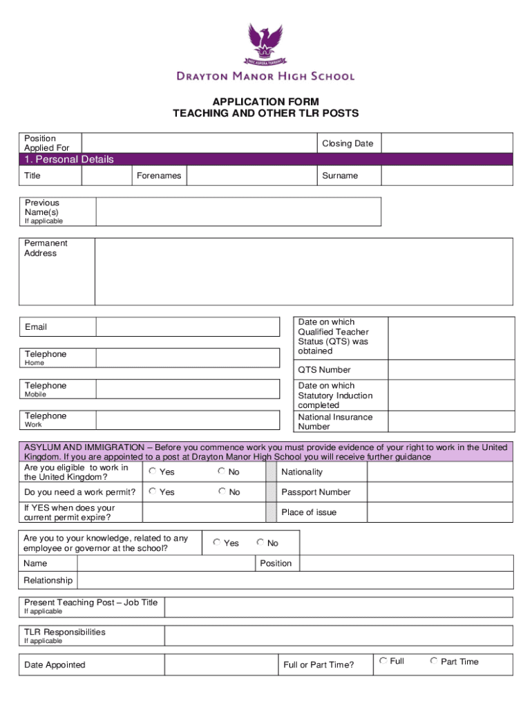 APPLICATION FORM TEACHING AND OTHER TLR POSTS Position Applied Foreclosing Date1. Personal Details TitleForenamesSurnamePrevious Name(s) If applicablePermanent Addressable on which Qualified Teacher