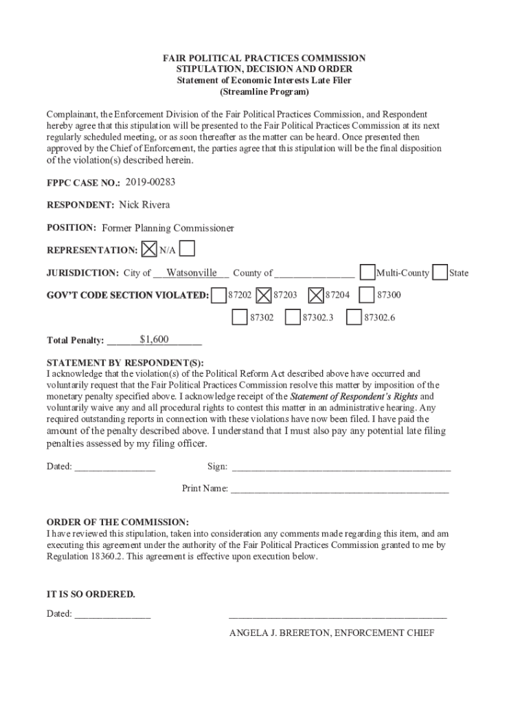 FAIR POLITICAL PRACTICES COMMISSION STIPULATION, DECISION AND ORDER Statement of Economic Interests Late Filer (Streamline Program) Complainant, the Enforcement Division of the Fair Political Practices