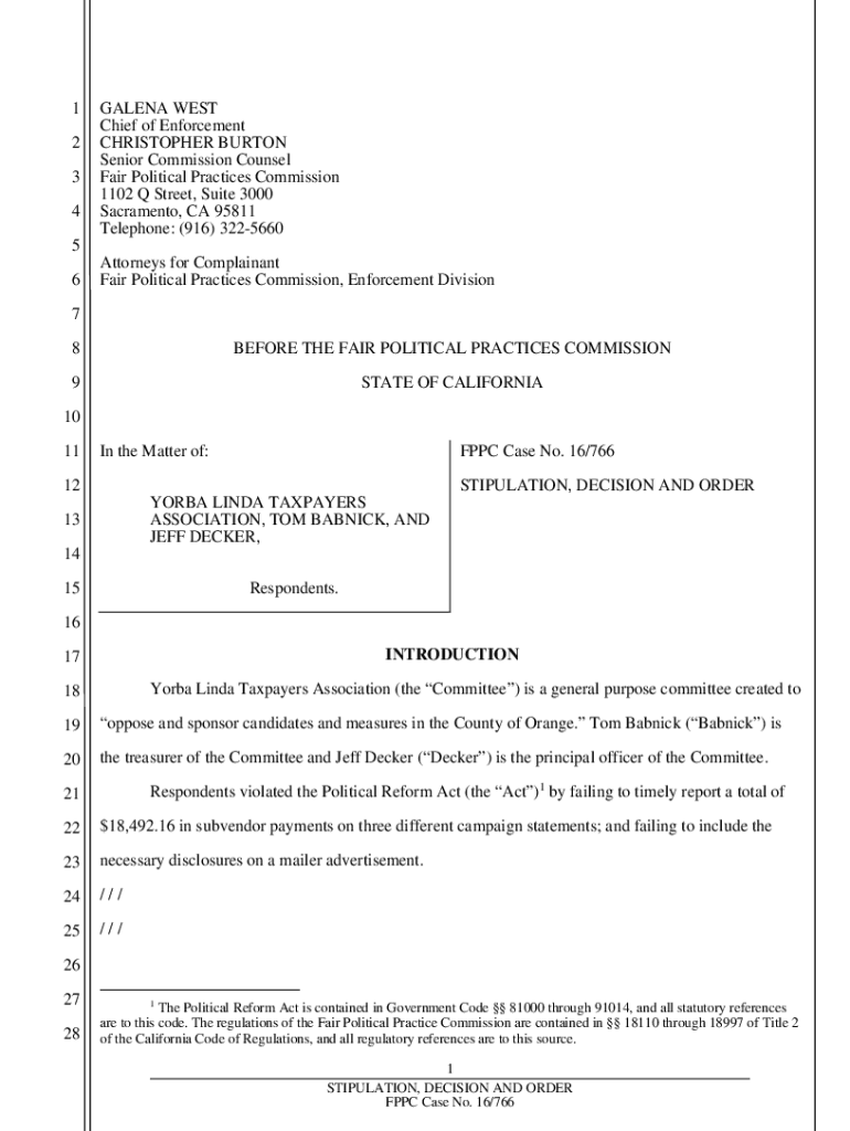 1 2 3 4GALENA WEST Chief of Enforcement CHRISTOPHER BURTON Senior Commission Counsel Fair Political Practices Commission 1102 Q Street, Suite 3000 Sacramento, CA 95811 Telephone: (916) 32256605 6Attorneys
