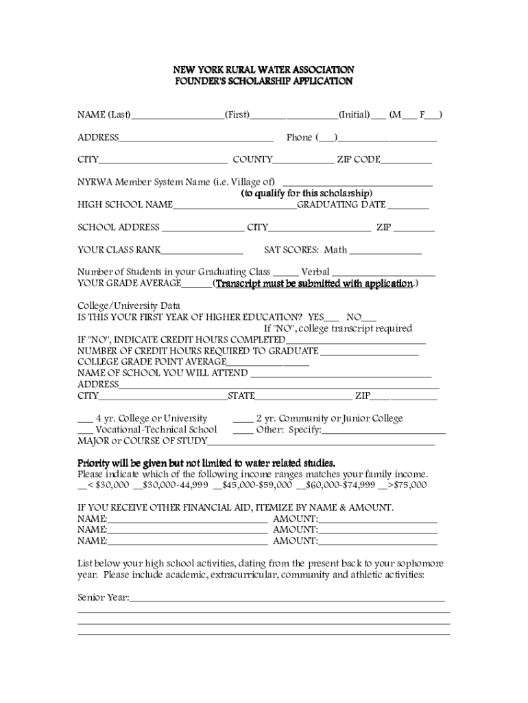 NEW YORK RURAL WATER ASSOCIATION FOUNDER\'S SCHOLARSHIP APPLICATION NAME (Last)___(First)___(Initial)___ (M___ F___) ADDRESS___Phone (___)___CITY___ COUNTY___ ZIP CODE___ NY RWA Member System Name