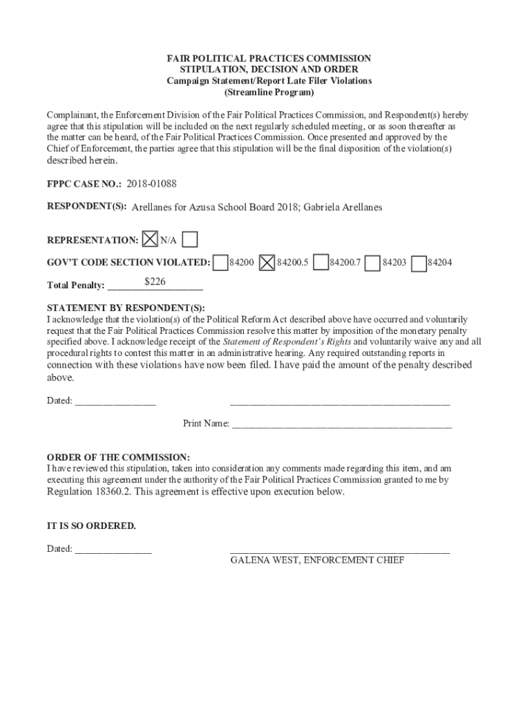 FAIR POLITICAL PRACTICES COMMISSION STIPULATION, DECISION AND ORDER Campaign Statement/Report Late Filer Violations (Streamline Program) Complainant, the Enforcement Division of the Fair Political
