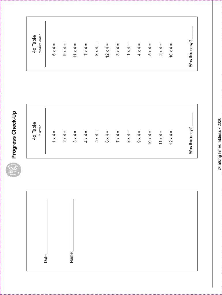 Name:Date:8×4 12 × 4 3×4 1×4 4×4 5×4 2×4 10 × 4 5×4 6×4 7×4 8×4 9×4 10 × 4 11 × 4 12 × 4 TalkingTimesTables.UK 2020Was this easy? ___7×44×4Was this easy? ___11 × 4 9×42×4 3×46×4in