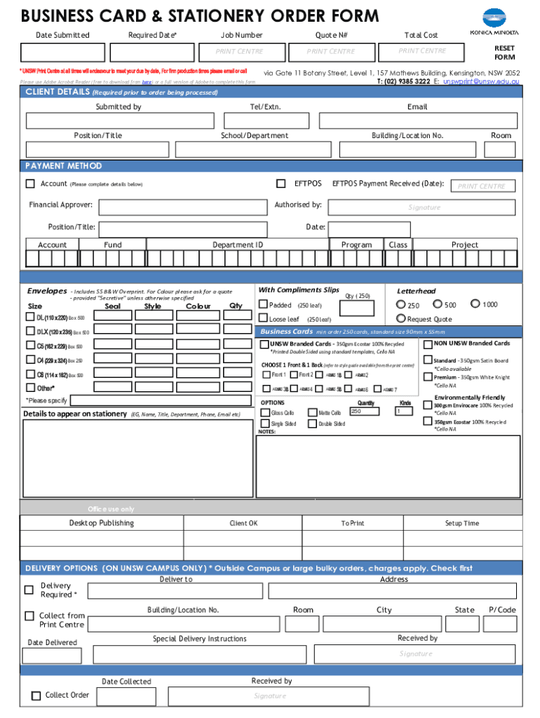 BUSINESS CARD & STATIONERY ORDER FORM Date SubmittedRequired Date×Job Number PRINT Center* UNSW Print Center at all times will endeavor to meet your due by date, For firm production times please