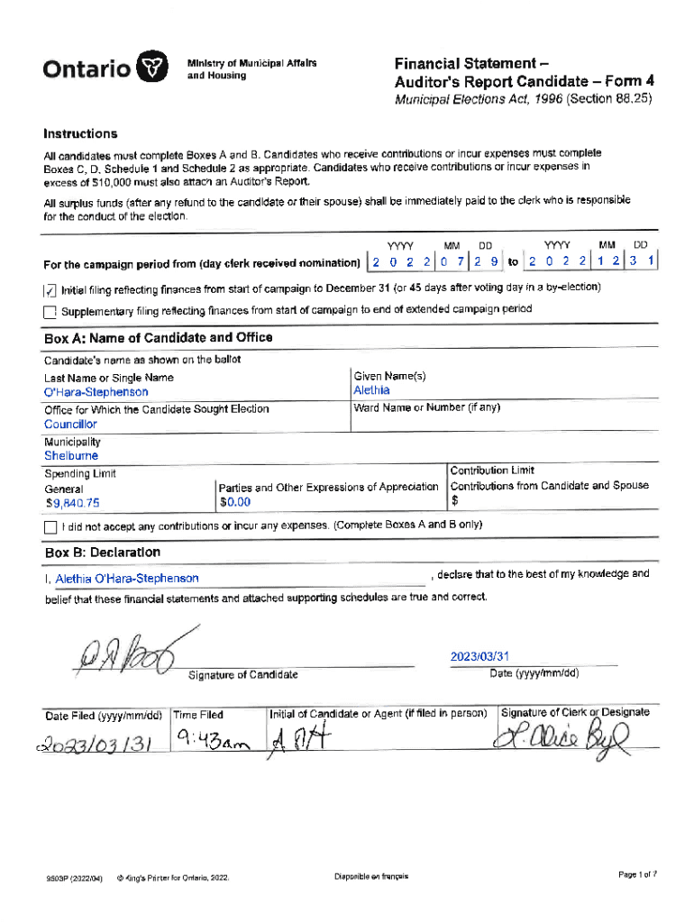 Ontario@Financial Statement Auditor\'s Report GandidateMinistry of Municipal Affairs and HousingForm 4Municipal Elections Act, 1996 (Section 88.25)Instructions All candidates must complete Boxes A