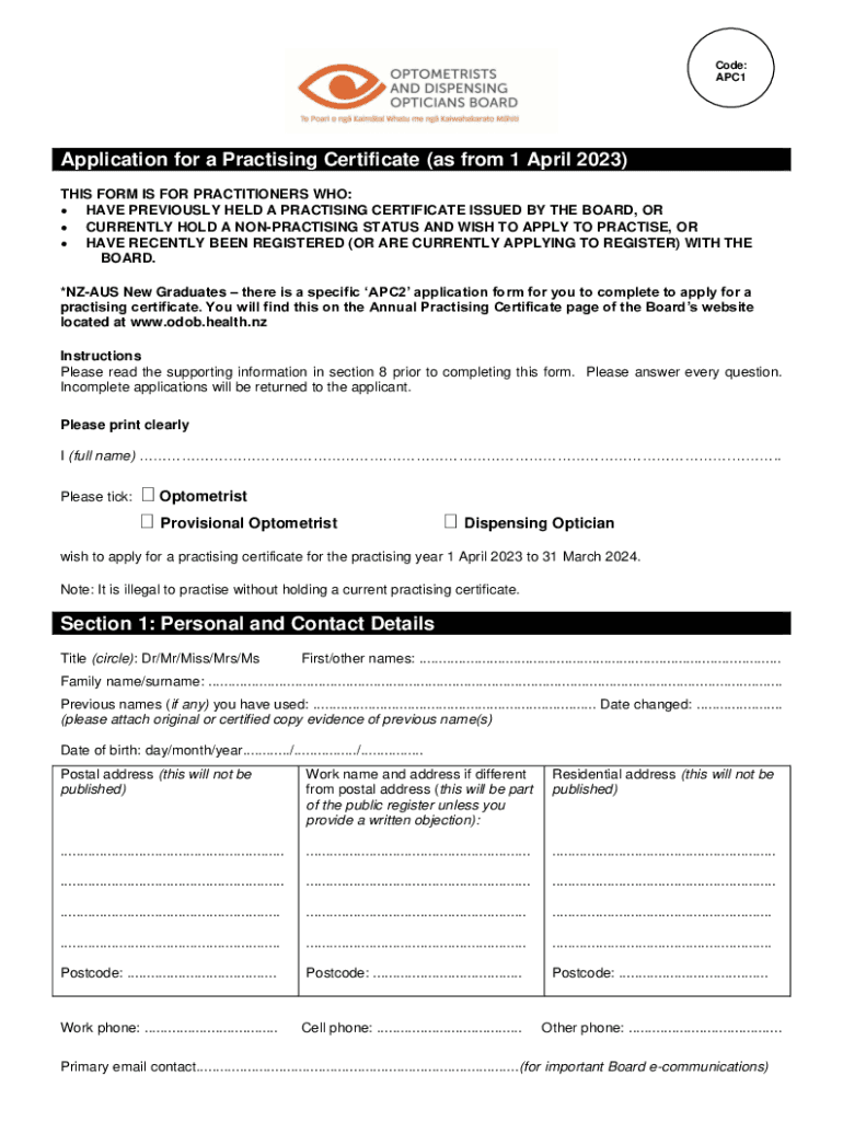 Code: APC1Application for a Practicing Certificate (as from 1 April 2023) THIS FORM IS FOR PRACTITIONERS WHO: HAVE PREVIOUSLY HELD A Practicing CERTIFICATE ISSUED BY THE BOARD, OR CURRENTLY HOLD A