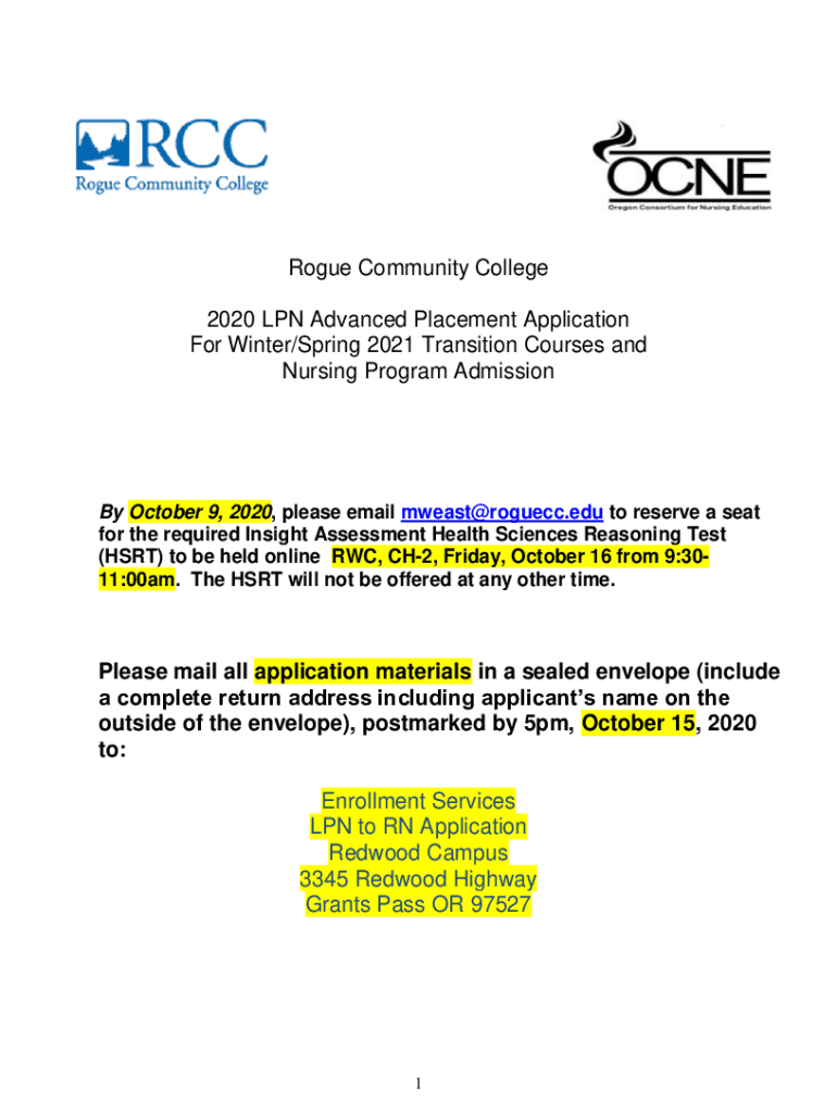 Rogue Community College 2020 LPN Advanced Placement Application For Winter/Spring 2021 Transition Courses and Nursing Program Admission October 9, 2020, please email mweast@roguecc.edu to reserve