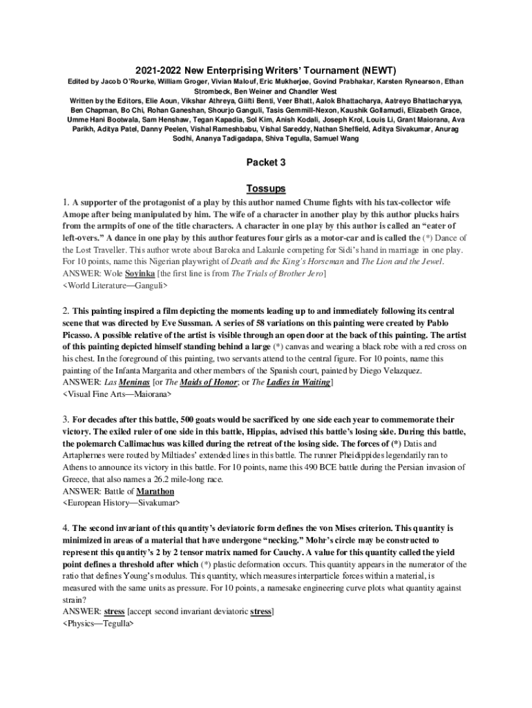 20212022 New Enterprising Writers Tournament (NEWT) Edited by Jacob Rourke, William Roger, Vivian Malone, Eric Mukherjee, Gov ind Prabhakar, Karsten Ryerson, Ethan Strobe, Ben Water and Chandler West