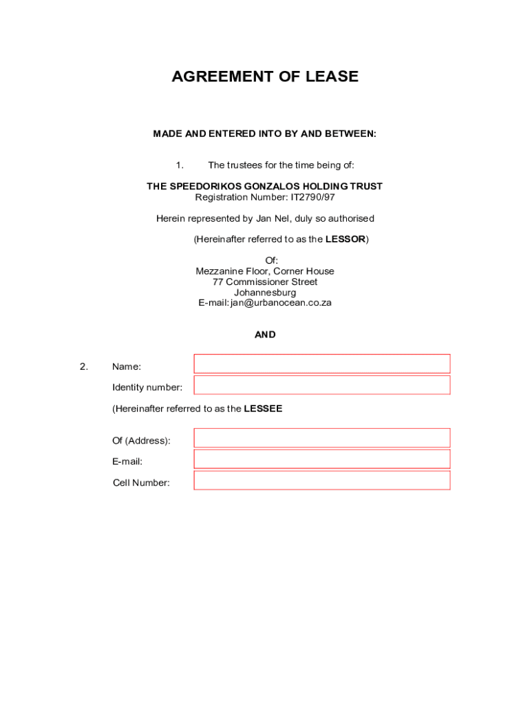 AGREEMENT OF LEASED AND ENTERED INTO BY AND BETWEEN: 1. The trustees for the time being of:THE SPEEDBRAKES GONZALES HOLDING TRUST Registration Number: IT2790/97 Herein represented by Jan New, duly