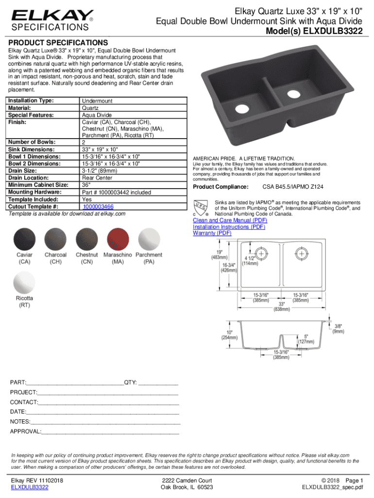SPECIFICATIONSElkay Quartz Luke 33\” x 19\” x 10\” Equal Double Bowl Under mount Sink with Aqua Divide Model(s) ELXDULB3322PRODUCT SPECIFICATIONS Elway Quartz Luke 33\” x 19\” x 10\”,