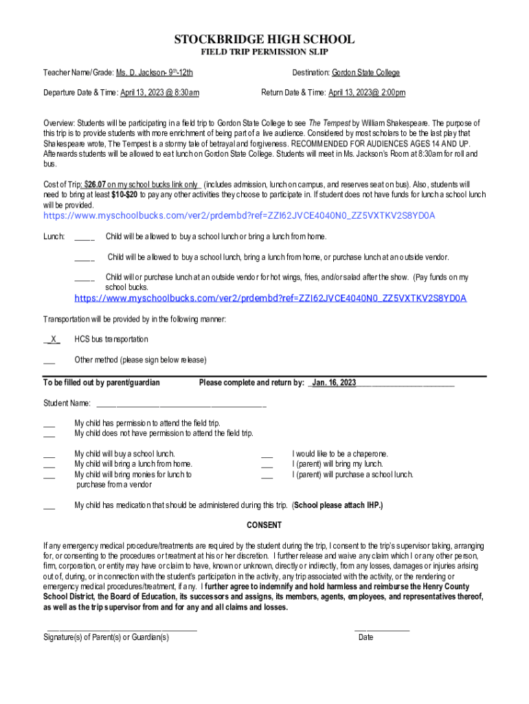 STOCKBRIDGE HIGH SCHOOL FIELD TRIP PERMISSION SLIP Teacher Name/Grade: Ms. D. Jackson 9th12thDestination: Gordon State CollegeDeparture Date & Time: April 13, 2023 @ 8:30amReturn Date & Time: April