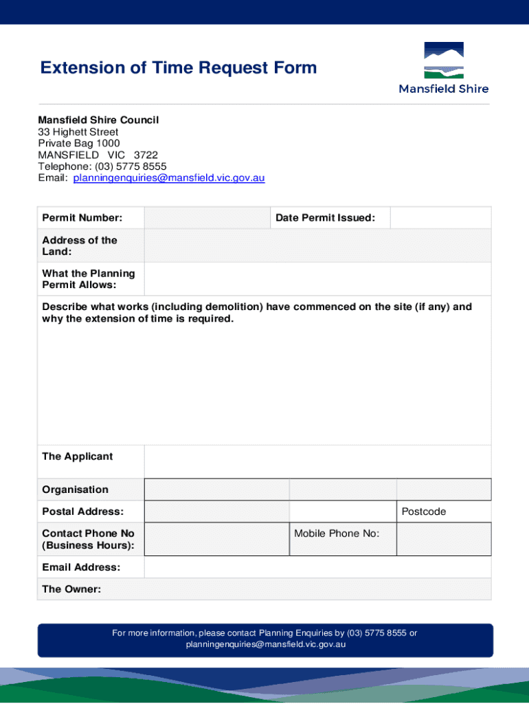 Extension of Time Request Form Mansfield Shire Council 33 Highest Street Private Bag 1000 MANSFIELD VIC 3722 Telephone: (03) 5775 8555 Email: planningenquiries@mansfield.vic.gov.auPermit Number:Date