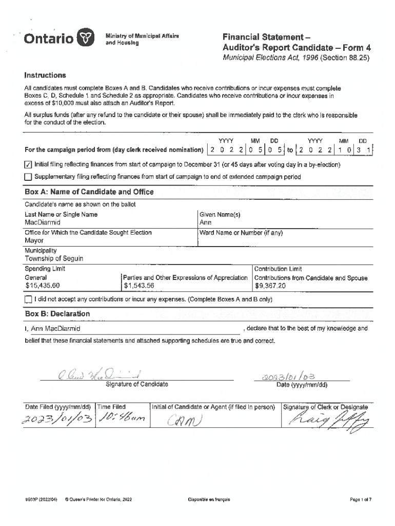 River I BII IMinistryofMunicipalAffairs and HousingFinancial Statement Auditors Report Candidate Form 4Municipal Elections Act, 1996 (Section 88.25) Instructions All candidates must complete Boxes