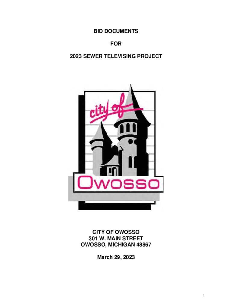 BID DOCUMENTS FOR 2023 SEWER TELEVISING PROJECTION OF OWASSO 301 W. MAIN STREET OWASSO, MICHIGAN 48867 March 29, 20231NOTICE TO BIDDERS 2023 SEWER TELEVISING PROJECT FOR THE CITY OF OWASSO, MICHIGAN