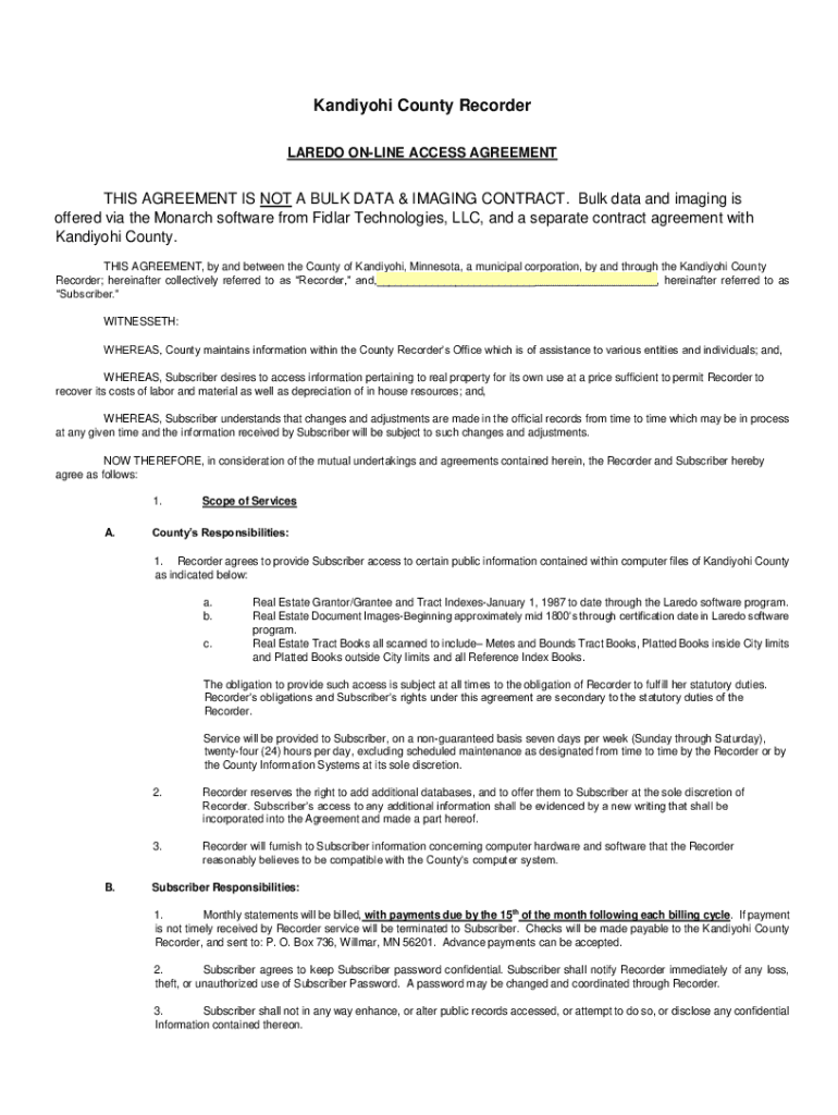 Kandiyohi County Recorder LAREDO ONLINE ACCESS AGREEMENTS AGREEMENT IS NOT A BULK DATA & IMAGING CONTRACT. Bulk data and imaging is offered via the Monarch software from Pillar Technologies, LLC,
