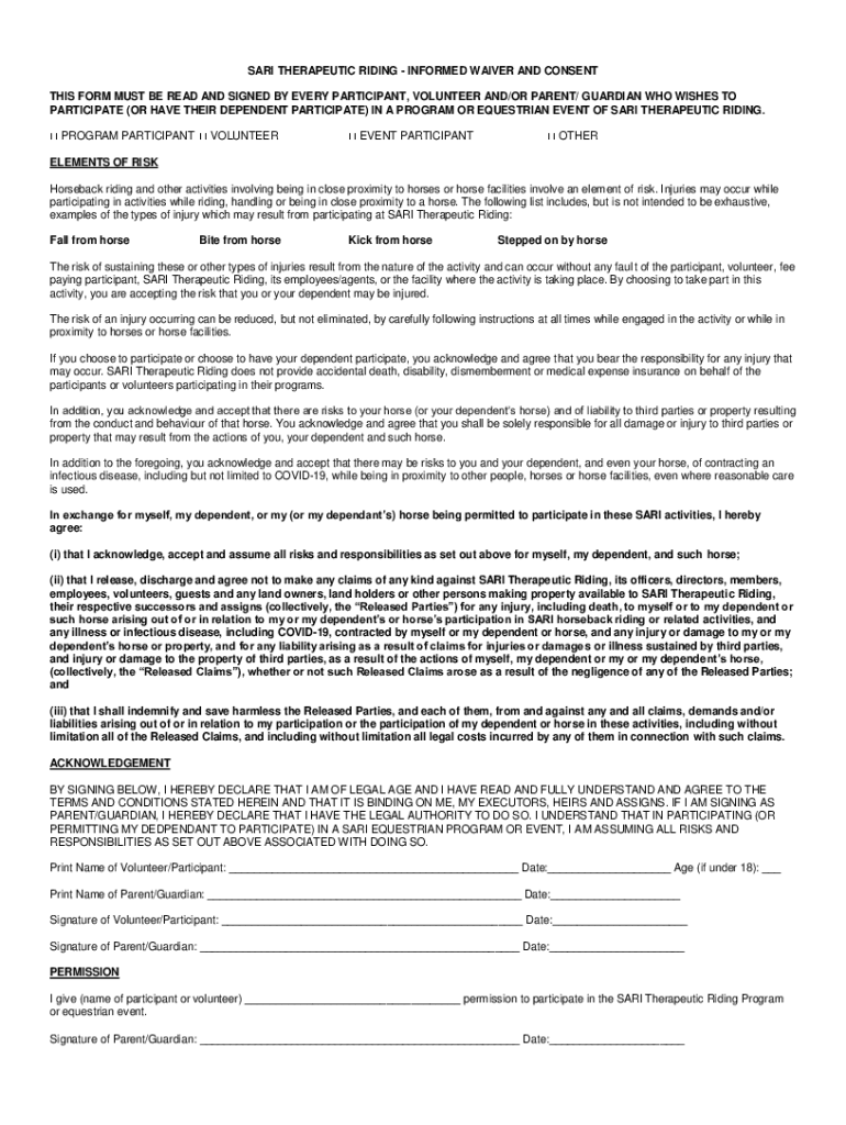 SARI THERAPEUTIC RIDING INFORMED WAIVER AND CONSENT THIS FORM MUST BE READ AND SIGNED BY EVERY PARTICIPANT, VOLUNTEER AND/OR PARENT/ GUARDIAN WHO WISHES TO PARTICIPATE (OR HAVE THEIR DEPENDENT PARTICIPATE)