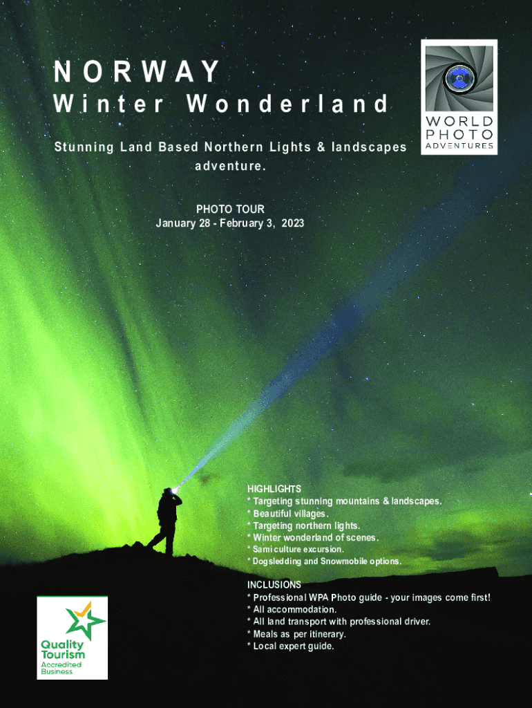 N O RWAYWinter Wonderland Stunning Land Based Northern Lights & landscapes adventure. PHOTO TOUR January 28 February 3, 2023HIGHLIGHTS * Targeting stunning mountains & landscapes. * Beautiful villages.